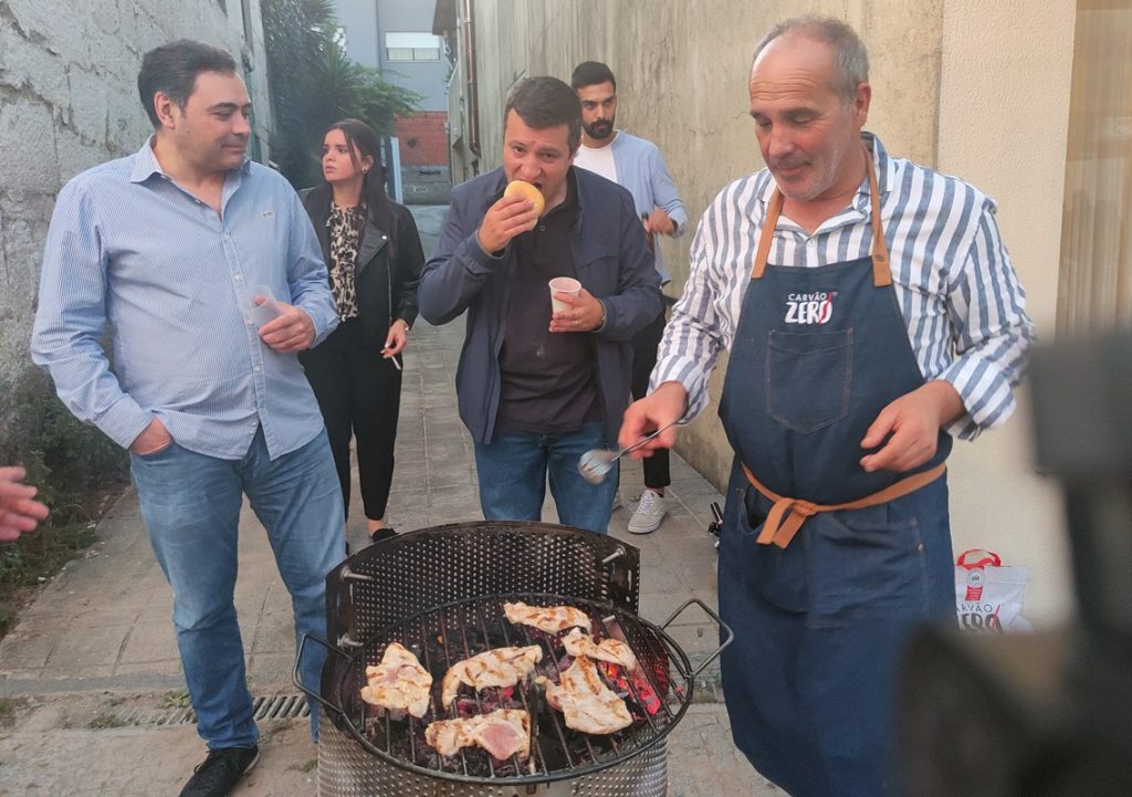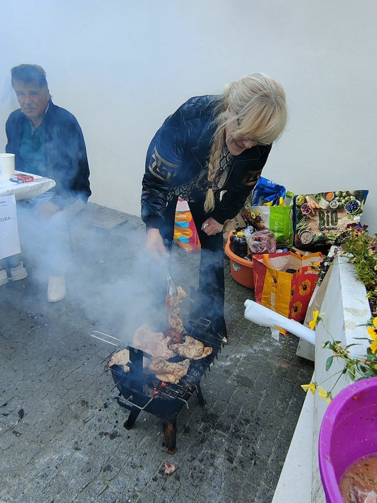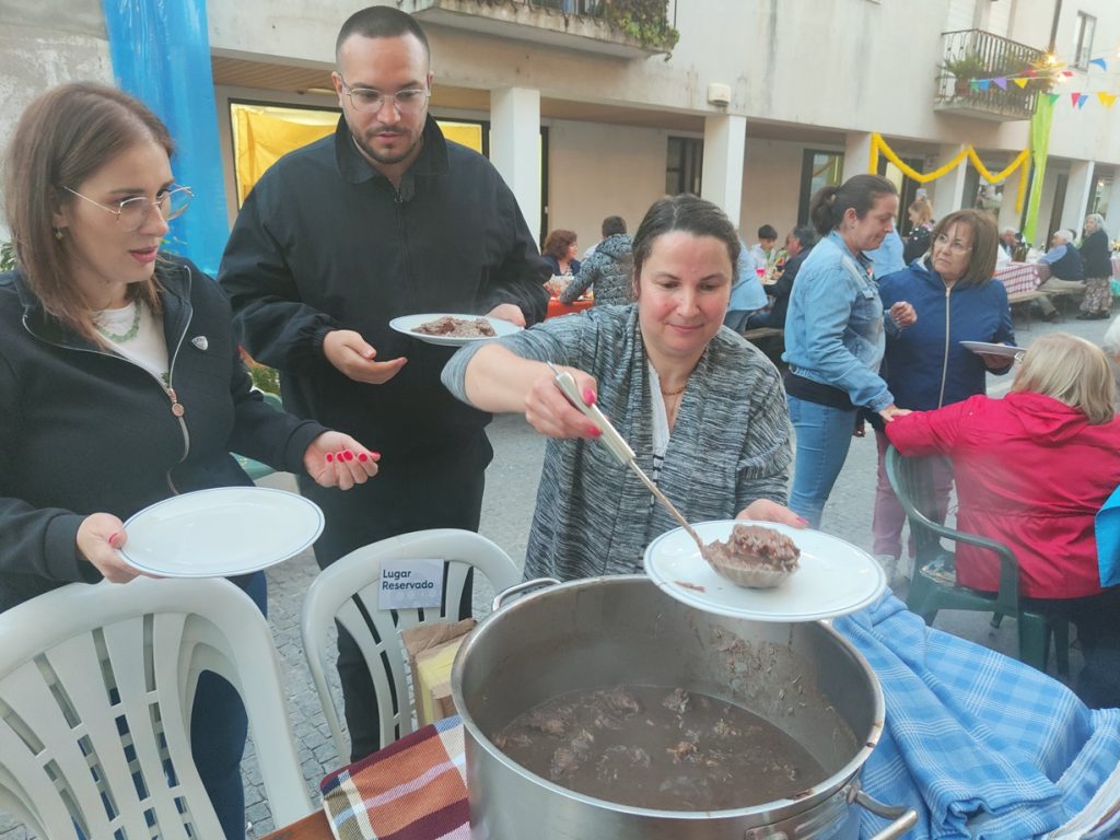 Poucos arribam ao local de mãos a abanar. A tarde ainda não se tinha despedido e os convivas já se instalavam nas respetivas mesas, com sacos abarrotados de iguarias, cestos com pão e bolos, bidões de sumo, garrafões de vinho, grades de cerveja. Há quem instale fogareiros e braseiros, grelhadores e máquinas para confecionar refeições na hora. Tachos e panelas são transportados com cozinhados ainda a fervilhar.
