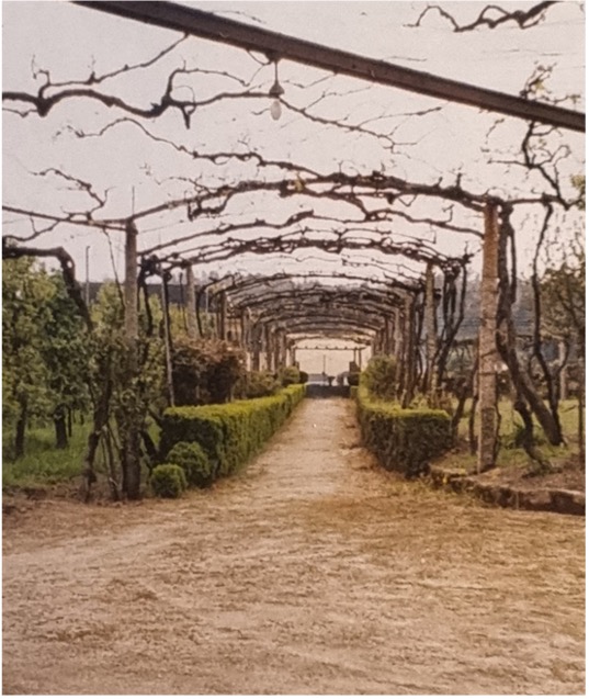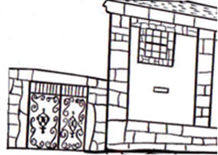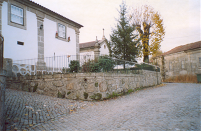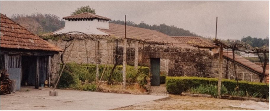 Casa primitiva dos primeiros proprietários (posteriormente casa de caseiro), beiral e eira, chaminé e portal em granito de acesso ao pátio interior (fechado).