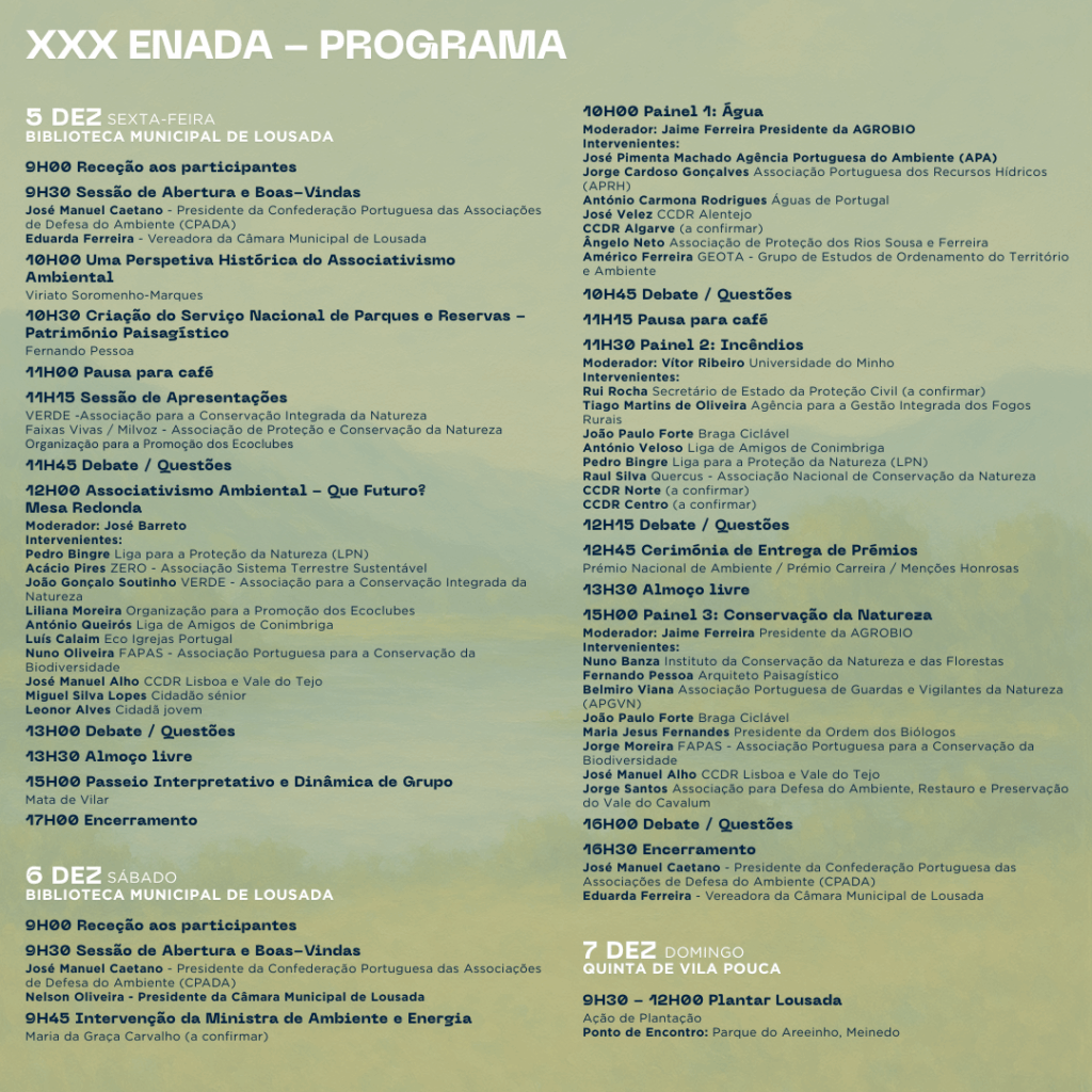 Confederação Portuguesa das Associações de Defesa do Ambiente (CPADA) promove, nos dias 5, 6 e 7 de dezembro de 2025, o 30.º Encontro Nacional das Associações de Defesa do Ambiente (ENADA), que este ano terá lugar na Biblioteca Municipal de Lousada, com o apoio do Município de Lousada.