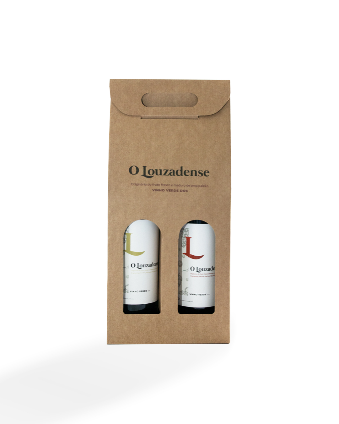 Caixa caracterizada com a marca do seu Vinho Verde DOC | O Louzadense. Ideal para compor um pack de duas garrafas de vinho à sua escolha. Uma sugestão para oferta, com sabor e identidade.